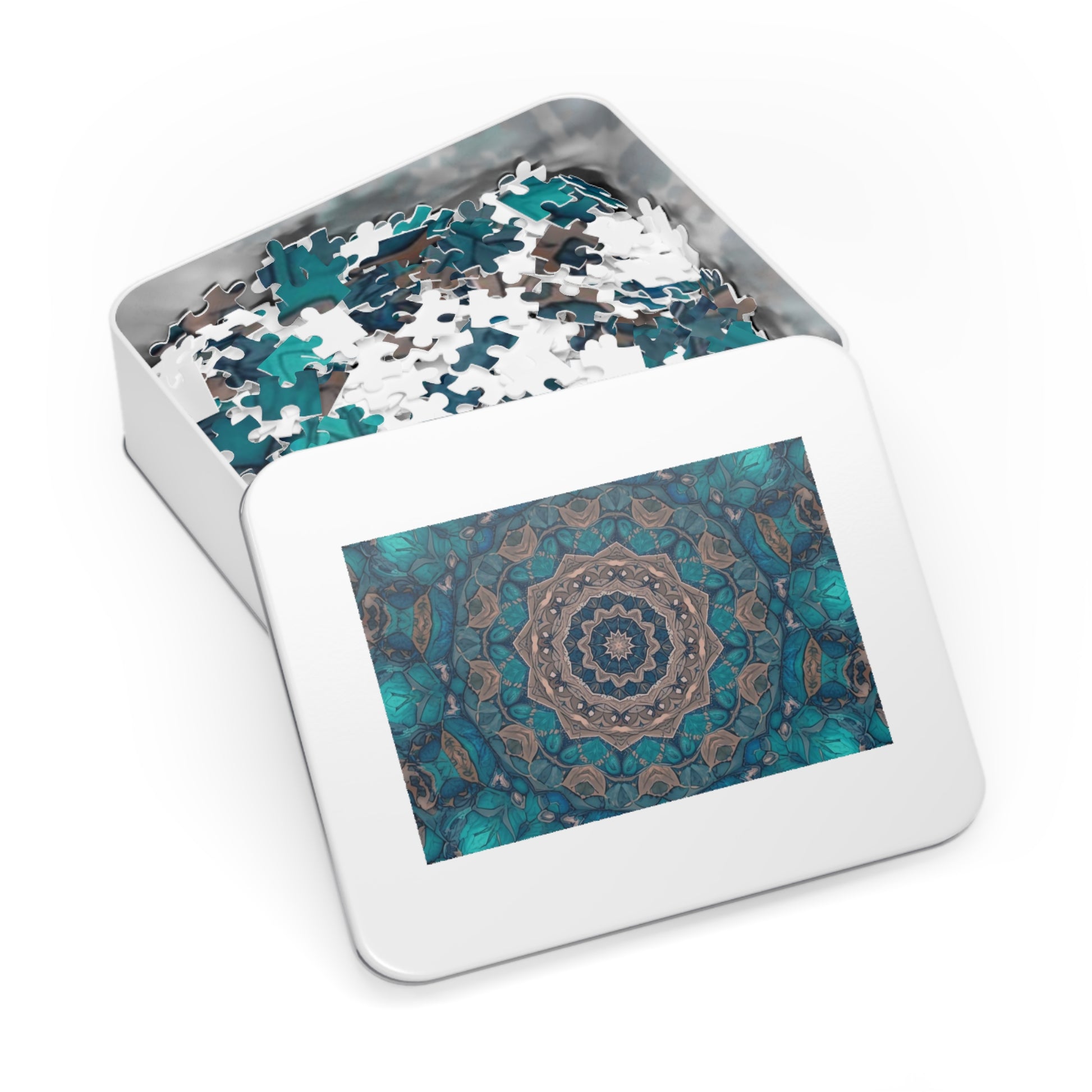 Turquoise Mandala Jigsaw Puzzle (with Tin) — 1000‑Piece Kaleidoscope Puzzle Gift